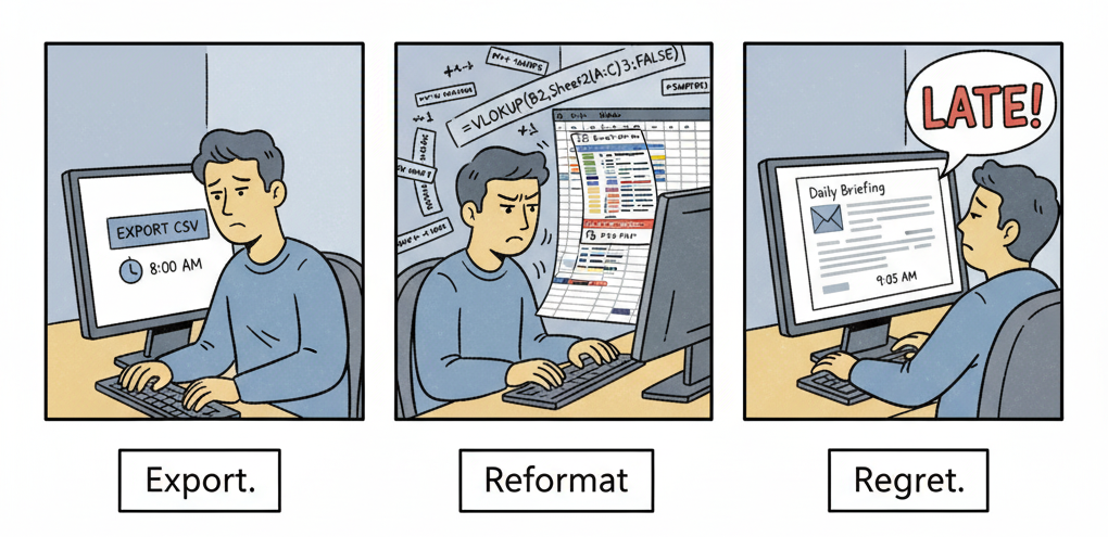 If you've ever started your day with an email titled "Daily Sales Report (WIP)", you already know the pain. The report's late, someone's fighting CSVs, and your leadership call turns into a group therapy session about version control.