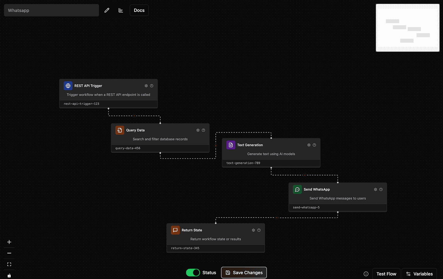 You can build a full WhatsApp-based logic system, where the user sends a message → workflow starts → conditions are checked → a dynamic reply is sent.